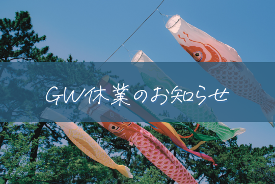 HOME > お知らせ > GW休業のお知らせ GW休業のお知らせ \ ゴールデンウィーク休業のご案内 / 5/3 (日)~5/6 (水) 上記の期間をゴールデンウィーク休業とさせていただきます 5/7(木) 9:00より通常営業いたします ※休業期間中に頂いたお問合せにつきましては5/7より順次ご対応いたします※お急ぎの場合は各担当者へ直接ご連絡ください※Instagram等のSNSへのお問合せも休業期間中は返信が遅くなる場合があります ご迷惑をお掛け致しますが、何卒ご理解いただきますようお願い致します < prev next >